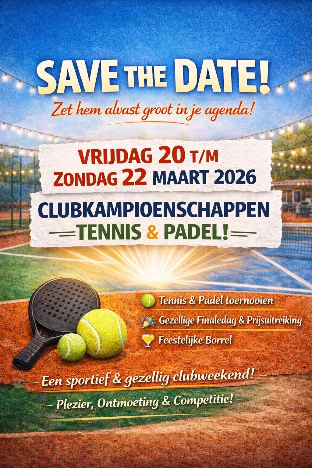 Van vrijdag 20 t/m zondag 22 maart 2026 organiseren wij bij TV Gennep, de Clubkampioenschappen Tennis & Padel!